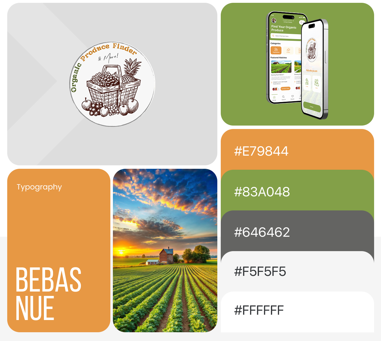 Organic Produce Finder’s brand identity reflects nature, freshness, and trust. Typography features modern yet organic fonts like Poppins for readability with hand-crafted accents for warmth. Clean layouts highlight products with minimal distractions.