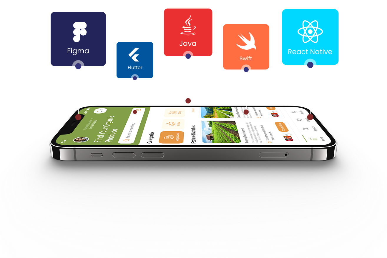 Organic Produce Finder is built using Flutter for a cross-platform mobile experience. Figma drives user interface design, while Adobe Illustrator handles branding and visuals. The backend runs on Node.js with MongoDB for scalable vendor and product data.