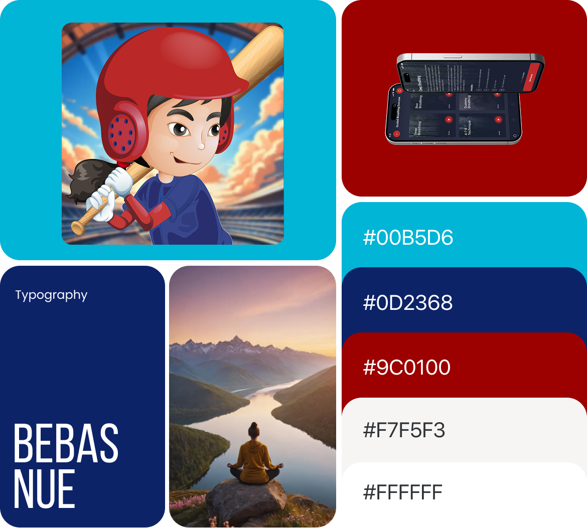The color palette reflects baseball’s heritage and energy:(#00B5D6) for passion, (#0D2368) for strength, (#9C0100) for clarity and (#F7F5F3) for authenticity. Secondary colors like (#FFFFFF) highlight rewards and achievements.